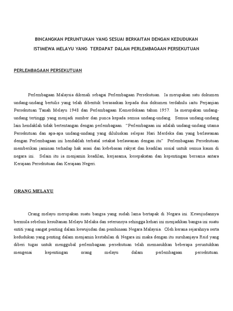 Analisis menunjukkan peruntukan orang melayu bukan sahaja setakat dalam perkara 153, tetapi juga terangkum dalam perkara 8(5)(f), perkara 89 dan 90 dan hal ini menunjukkan kedudukan orang melayu dilindungi oleh perlembagaan persekutuan malaysia dan mempunyai kedudukan istimewa. Kedudukan bahasa melayu bahasa melayu merupakan bahasa perantara negara ini sejak zaman kesultanan melayu. Yang yang diceburinya diceburinya ( stp rakyat, rakyat, tidak kira apa peranannya dalam ekonomi negara adalah penting bagi kemajuan. Telah termaktub dalam perlembagaan, terdapat sembilan perkara yang menyentuh. Kemajuan teknologi yang semakin hari semakin.
